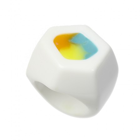 A monobloc, irregular shape in white acrylic with colored epoxy inclusions. This ring is available in two sizes: 55 and 59. Measurements are 2,5 cm ( 1 in) by side and 0,9 ( 0,4 in) in the top of the ring.
