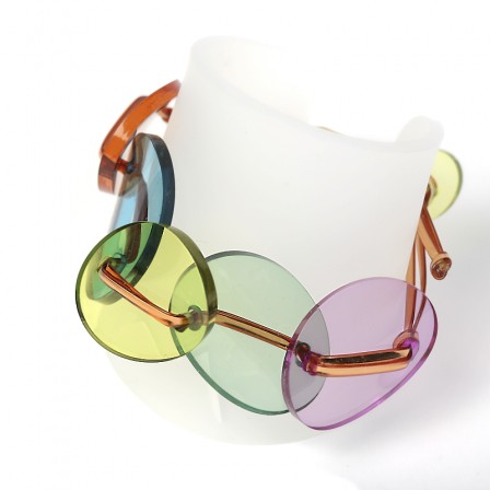 GREENCAST curved elements, recycled and recyclable acrylic . They are assembled with a  transparent and metallized acrylic ribbon . Bracelet adjustable from 17 cm to 22 cm ( 6,7 to 8,7 in). Transparent and opaque acrylic .