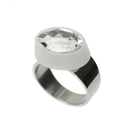 Opaque Acrylic Component , in which is inserted an oval crystal. The ring is made of hypoallergenic stainless steel. This model is available in 3 sizes : 52, 56, and 60. The Acrylic's measurements are 1,8 x1,3 cm (0,7 x 0,5 in) Recyclable transparent Bioplastic packaging.