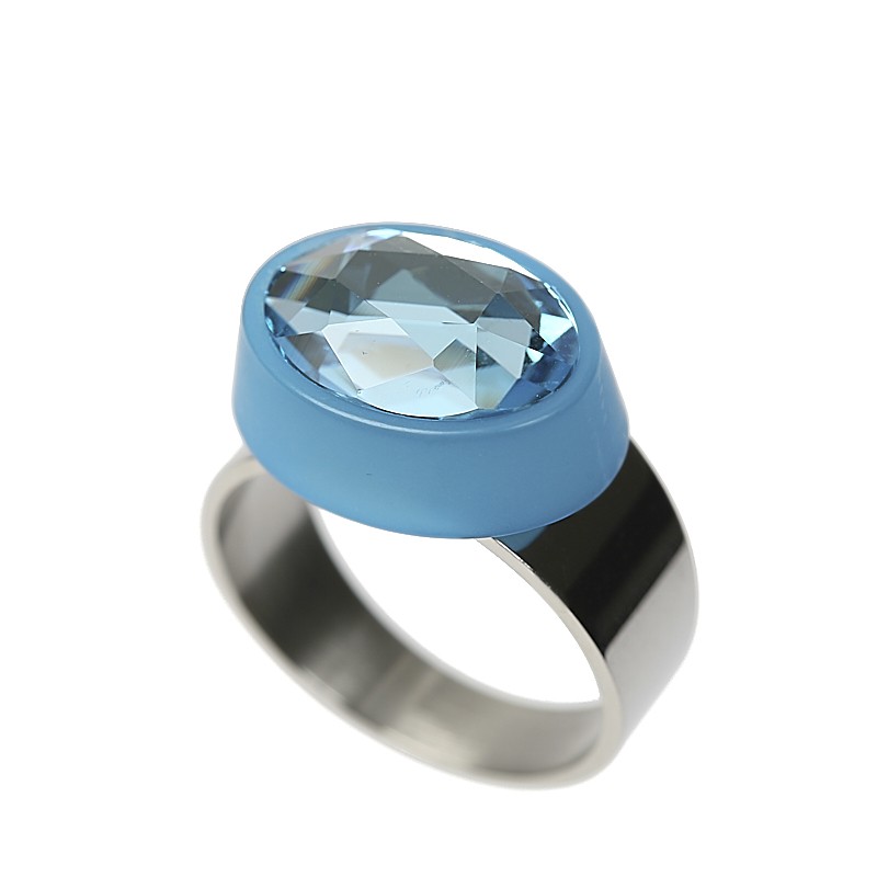 Opaque Acrylic Component , in which is inserted an oval crystal. The ring is made of hypoallergenic stainless steel. This model is available in 3 sizes : 52, 56, and 60. The Acrylic's measurements are 1,8 x1,3 cm (0,7 x 0,5 in) Recyclable transparent Bioplastic packaging.