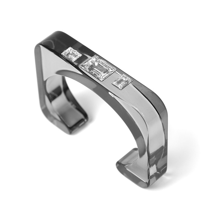 Rigid bracelet made of regenerated acrylic, thickness 14 mm. Three crystals are inserted in the upper part. This model is available in 3 sizes, internal dimensions: 2,2 X 1,37 in, 2,36 X 1,57 in, and 2,7 X 1,77 in.
