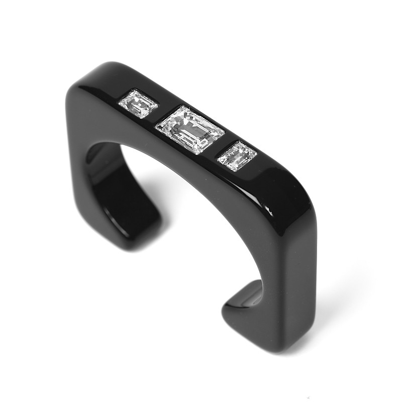 Rigid bracelet made of regenerated acrylic, thickness 14 mm. Three crystals are inserted in the upper part. This model is available in 3 sizes, internal dimensions: 2,2 X 1,37 in, 2,36 X 1,57 in, and 2,7 X 1,77 in.