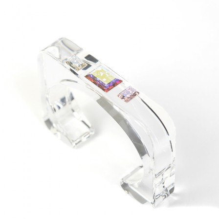 Rigid bracelet made of regenerated acrylic, thickness 14 mm. Three crystals are inserted in the upper part. This model is available in 3 sizes, internal dimensions: 2,2 X 1,37 in, 2,36 X 1,57 in, and 2,7 X 1,77 in.