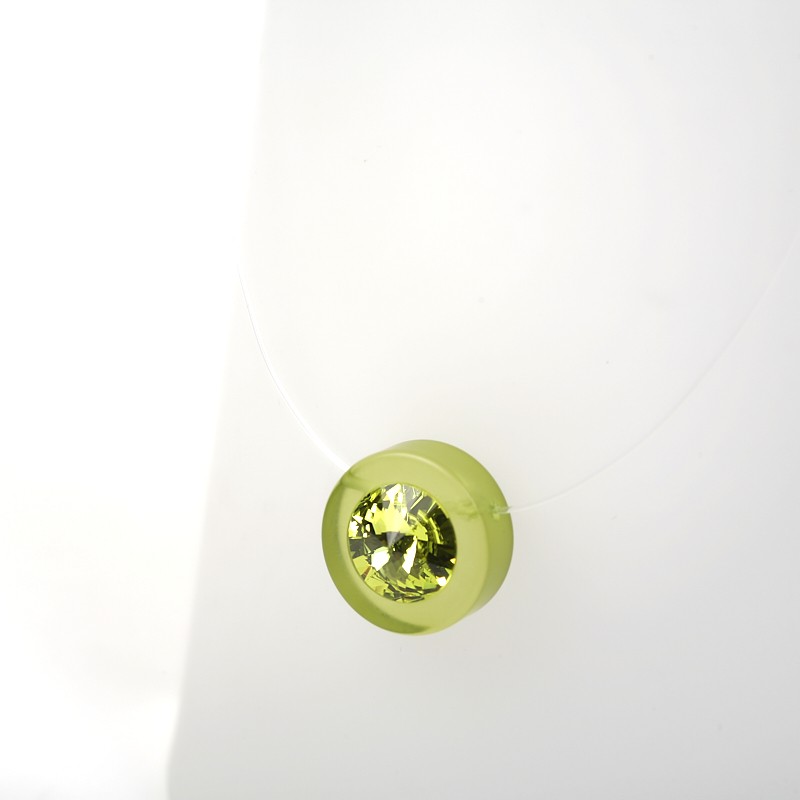 Un éléments en Plexiglas dans lequel est fixé un fil de nylon . Un cristal est inséré au centre .