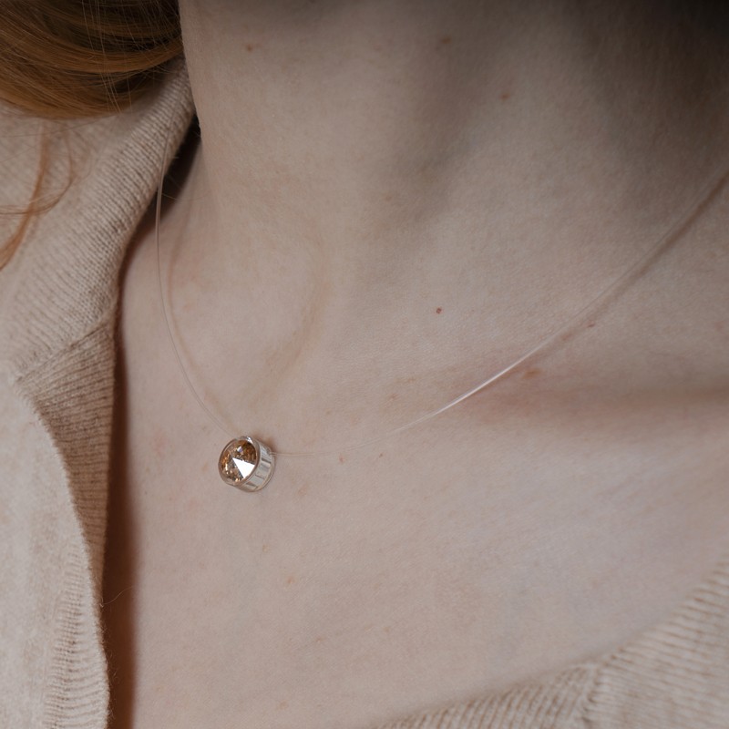 Element en Plexiglas dans lequel est fixé un fil de nylon . Un cristal est inséré au centre .