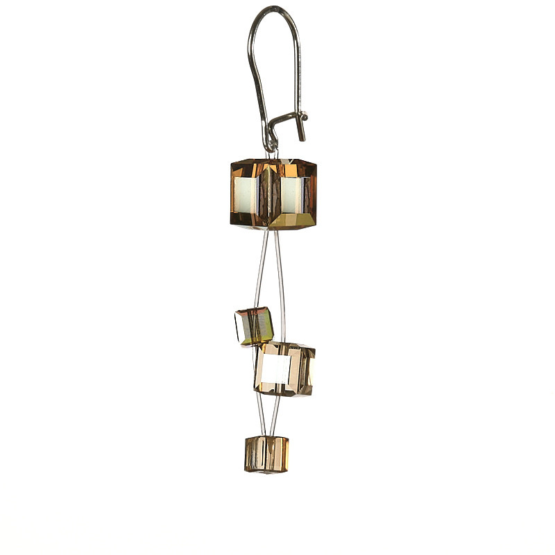Boucles d’oreilles composées de cubes de cristal de différentes dimensions . Ceux ci sont montés sur 2 rangs de fil nylon.