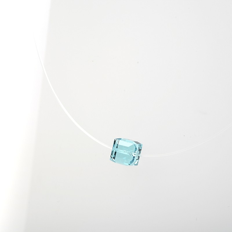 Pendentif composé d’un cube de cristal monté sur un fil de nylon. Le cube mesure 8 mm de coté.