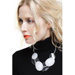 Un ruban en Acrylique transparent métallisé supporte les pièces, le collier peut se porter en raz de cou ou plus long.