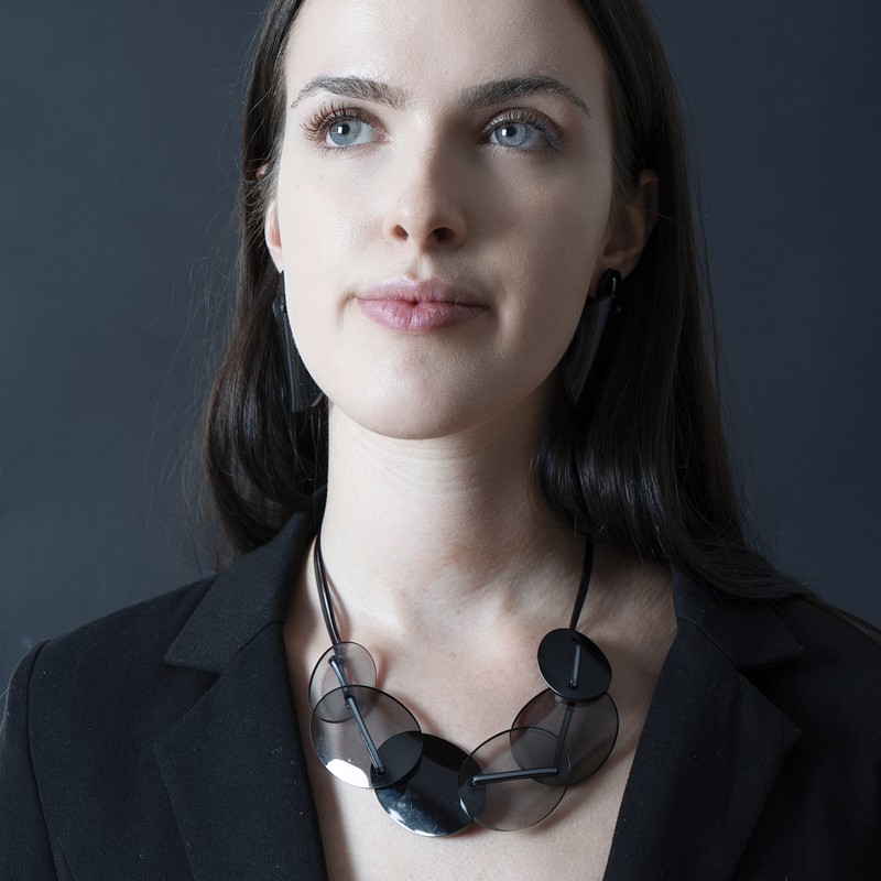 Un ruban en Acrylique transparent métallisé supporte les pièces, le collier peut se porter en raz de cou ou plus long.