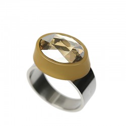 Élément en Acrylique opaque, dans lequel est inséré un cristal ovale. L’anneau est en acier inoxydable anallergique .Ce modèle est disponible en 3 tailles : 52, 56 et 60. Les dimensions de l'Acrylique sont de 1,8 x 1,3 cm. Packaging transparent en Bioplastique recyclable.