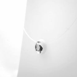 Element enAcrylique opaque dans lequel est fixé un fil de nylon . Un cristal ovale est inséré au centre . Les dimensions de l'Acrylique sont de 1,8 x 1,3 cm et l’épaisseur est de 5 mm. La longueur du fil intérieur est de 42,5 cm. Un réglage permet de réduire la longueur totale de 2 cm. Ce modèle existe également en long ( L ), + 5 cm.