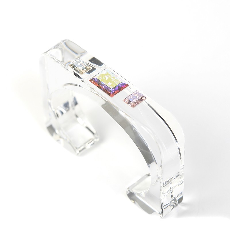 Bracelet rigide en Acrylic régénéré, l'épaisseur est de 14 mm. Trois cristaux sont insérés en partie supérieure. Ce modèle est décliné en 2 tailles, dimensions intérieures : 5,6 X 3,5 cm et 6 X 4 cm.
