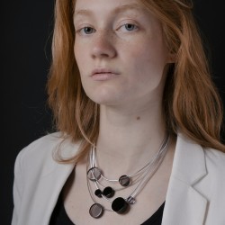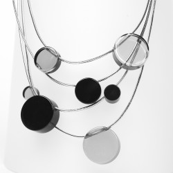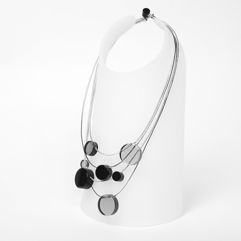 Eléments en Plexiglas de différents diamètres répartis sur un fil élastique métallisé ( sans nickel ).Le collier est composé de plusieurs rangs .
