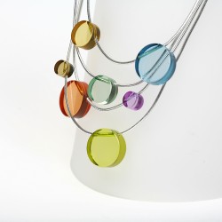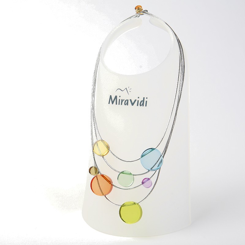 Eléments en Plexiglas de différents diamètres répartis sur un fil élastique métallisé ( sans nickel ).Le collier est composé de plusieurs rangs .