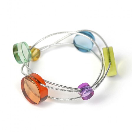 Eléments en Plexiglas de différents diamètres répartis sur un fil élastique métallisé ( sans nickel ).